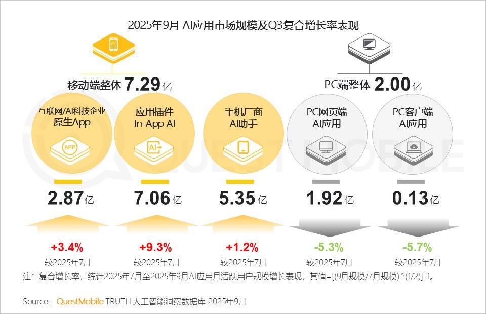 QuestMobile数据显示,截止到2025年9月,AI应用市场上移动端和PC端月活跃用户量分别达到7.29亿、2.00亿,其中,移动端原生APP、In-APP AI及手机厂商AI助手整体规模分别为2.87亿、7.06亿、5.35亿,三季度复合增长率分别为3.4%、9.3%、1.2%。